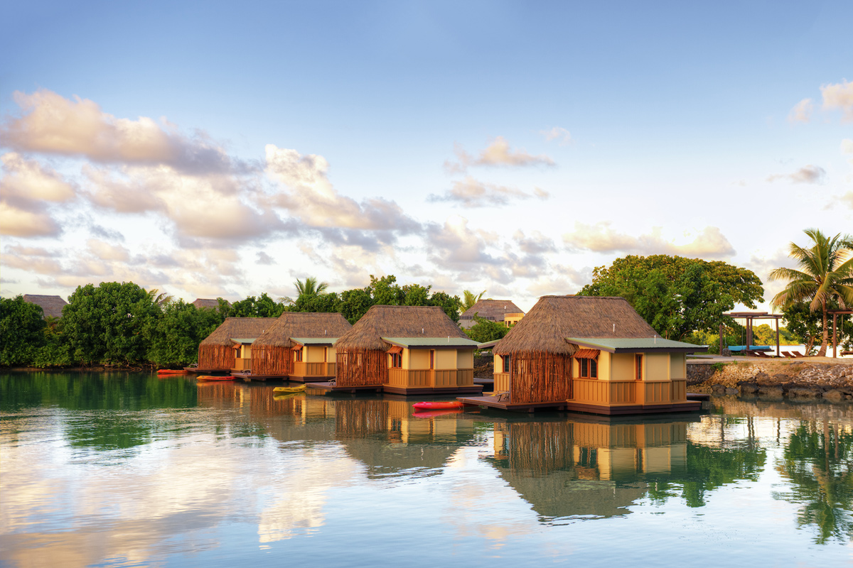 We have a broad range of accommodations here, including overwater bungalows which actually float on the water, and larger, two-story, two-bedroom overwater villas in a semi-separate, private section of the resort.