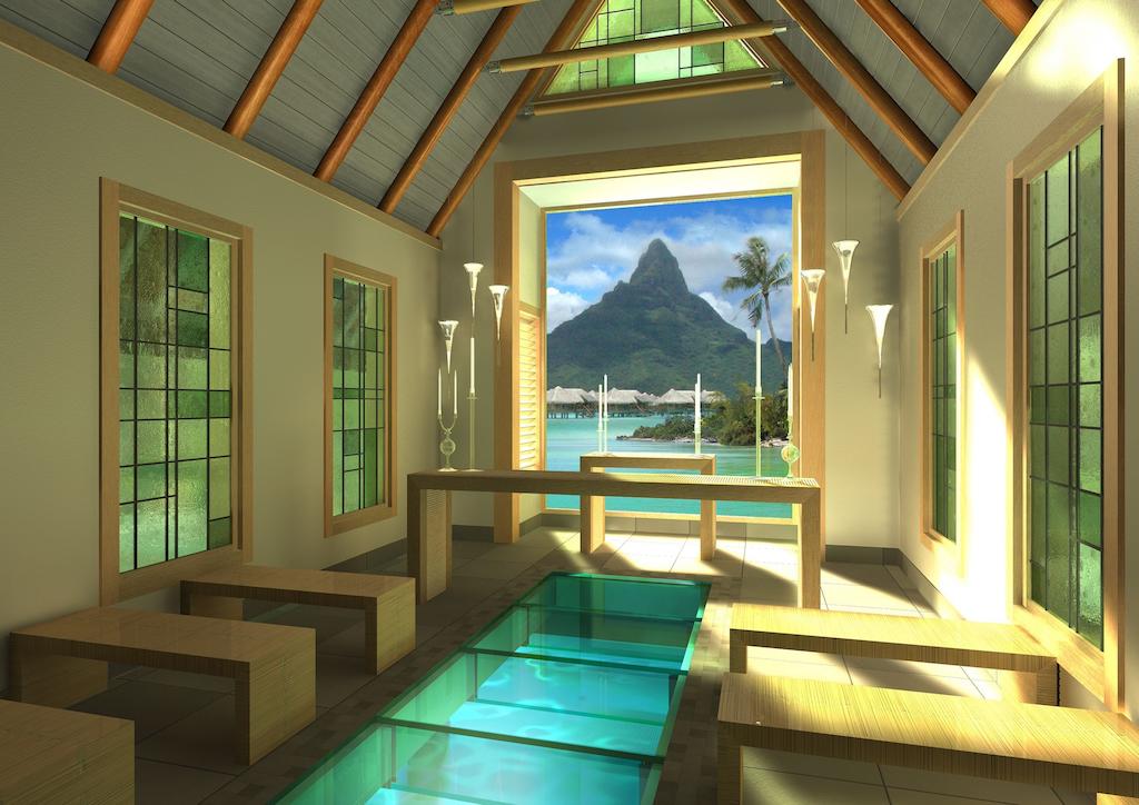 It has a glass aisle that overlooks the coral and a large window behind the altar which frames perfectly Mount Otemanu across the lagoon.