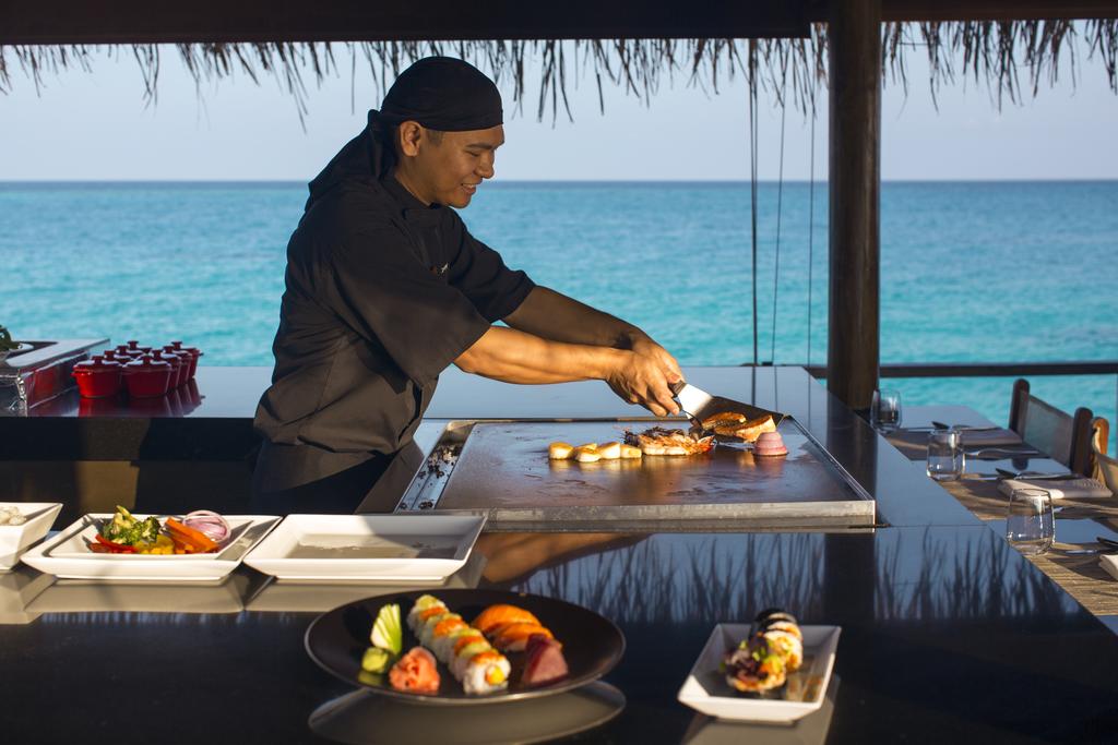 The Sand restaurant serves seafood and is entirely outdoors. It sits directly on the beach while their Teppanyaki grill house is housed in an overwater hut and does both Teppanyaki and hibachi.